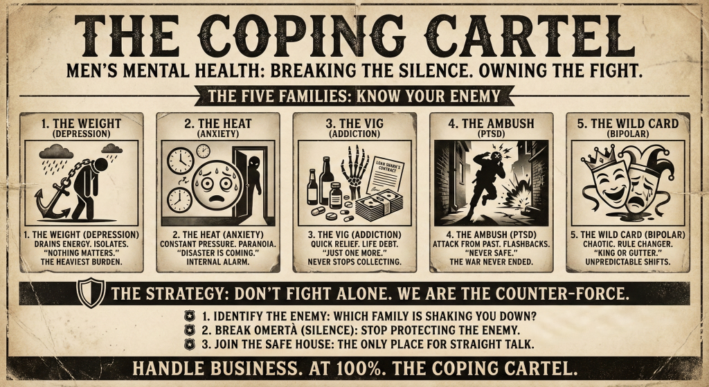 Your mind is your territory. The Coping Cartel is here to help you defend it. We help you build the walls, secure the perimeter, and evict the thoughts that are trying to rob you.